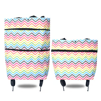 A shopping bag that makes the bag bigger and smaller by zipper. It is used daily for grocery shopping, travel shopping, towing or shoulders are very practical, and with two wheels.