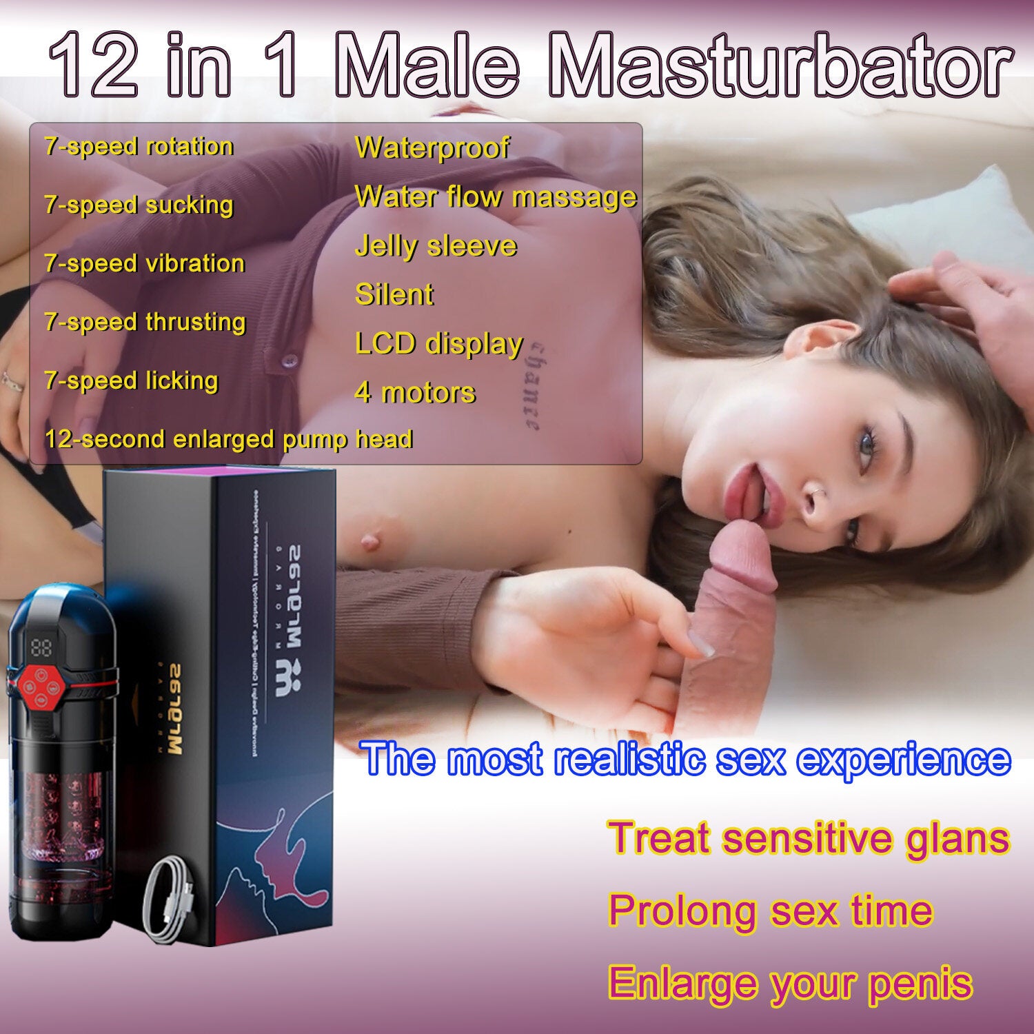 Integrates six functions in one. This male sex toy has 7 thrusts, 7 rotations, 7 suctions, 7 vibrations and a 12-second penis pump, integrated with the LCD screen. In addition, this adult toy is equipped with a soft and red 3D enhanced transparent sleeve